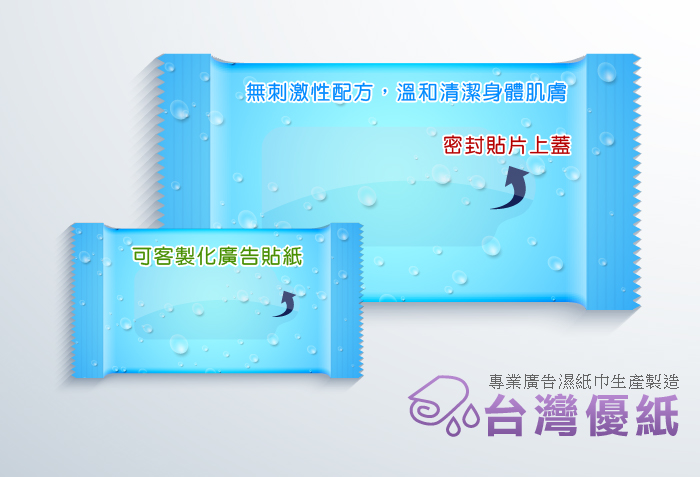 台灣優只生產各類: 一般用濕紙巾、客製包裝濕紙巾、選舉濕紙巾、公版透明濕紙巾、濕紙巾、廣告濕紙巾、宣傳濕紙巾溼紙巾、廣告溼紙巾...等。 除上述品項之外,如您有任何特殊開發需求用在濕紙巾上面,請告知我們,我們非常歡迎與各類產業一同開發合作。